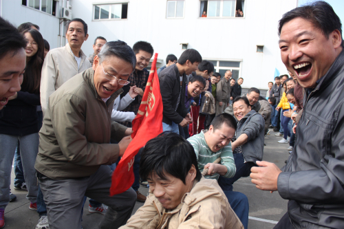 拔河比賽是最考驗團(tuán)隊凝聚力的項目了。裁判員一聲令下,所有的選手勁往一處使,勒緊麻繩不放松,在強(qiáng)有力的“1、2、3”的口號下,每個參賽者使出九牛二虎之力,把繩子往自家起點線邊拉。只見繩索中心的紅線忽而左忽而右,參賽選手們絲毫不放松,腿彎了、差點就坐在地上了,大家又一股力量地往回拉。圍觀的同事們急得直跺腳,嘴上喊著“加油、加油”,手還一直往一邊“推”,好像自己也在拉著比賽繩一樣。在這場力量與意志的比拼中,拓寶二、營銷二部、草坪灌溉聯(lián)合組奪得了最后的勝利。