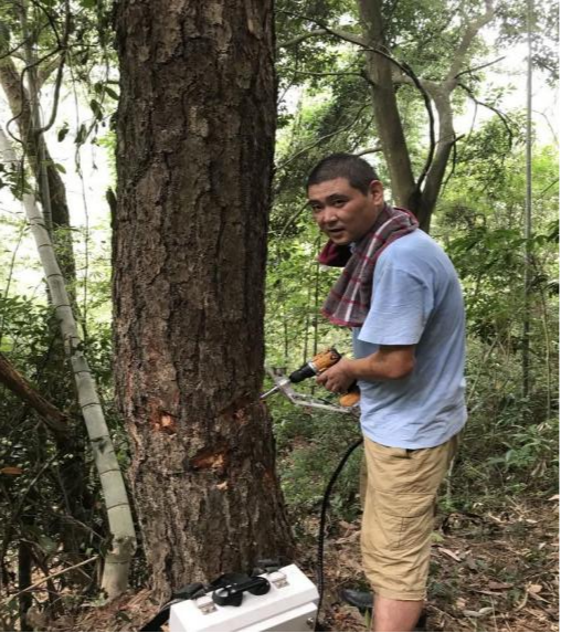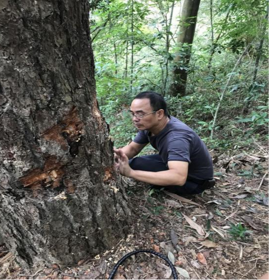 2022年9月8號,汪洋帶上綠友電動樹干打孔注藥機(jī)、木塞、藥品以及相應(yīng)工具。早上五點(diǎn)鐘從廣州出發(fā),舟車勞頓數(shù)百公里,踏上拯救坪坑參天古樹的旅程。趕到潮州坪坑村,村委部文主任領(lǐng)路去村后的山上查看古松樹。在看過所有的古樹以后,根據(jù)松樹的枯葉癥狀,樹木呈現(xiàn)出來的病癥,最后診斷確認(rèn)是松材線蟲危害所致。汪洋將診斷結(jié)果以及解決方案告知文主任,并通過電話向省林業(yè)部領(lǐng)導(dǎo)作匯報,得到批復(fù)后立即展開作業(yè)。