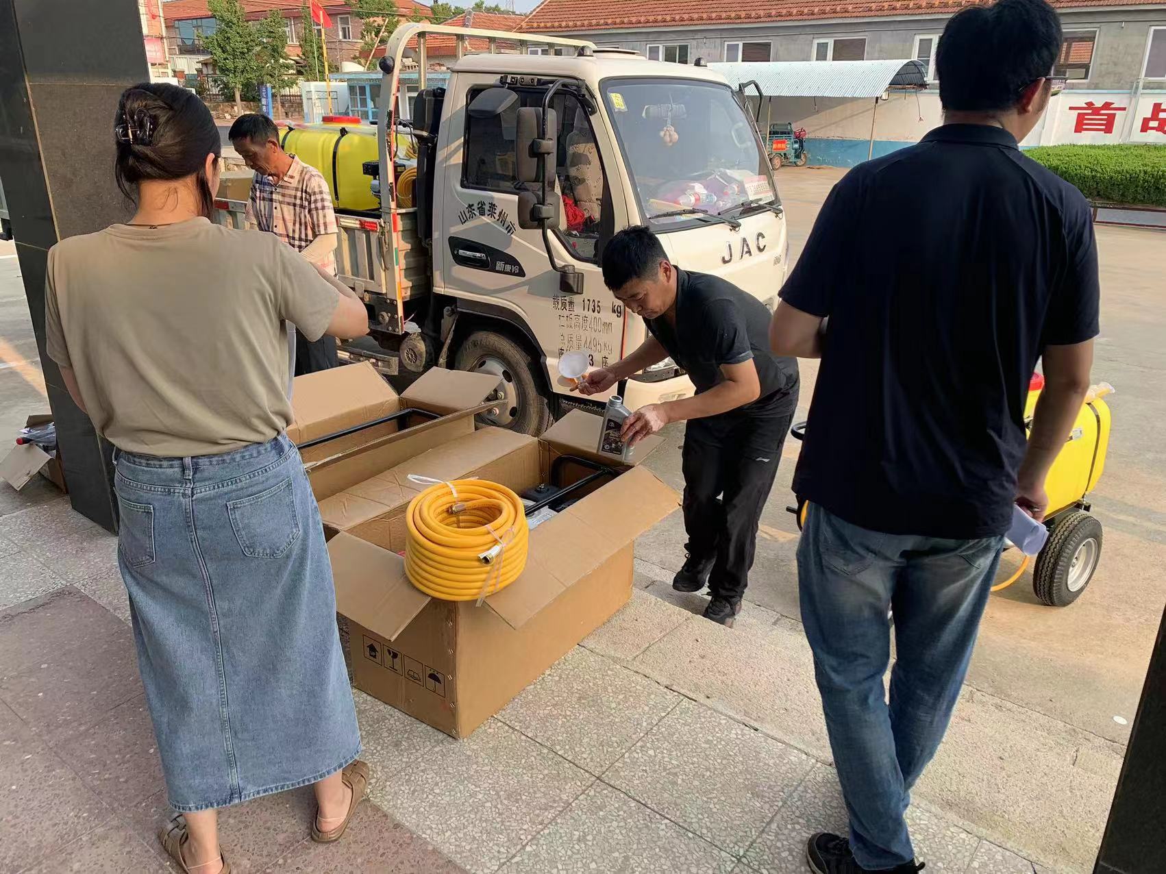 工具到貨,為盡快完成供貨,濰坊綠友的同事們一件件、一箱箱卸到庫房,根據(jù)每個鎮(zhèn)的需求,按型號按數(shù)量分裝、核對,為打藥機加注機油以便客戶使用。汗水模糊視線、打濕衣襟,卻毫不影響同事們的工作勁頭。