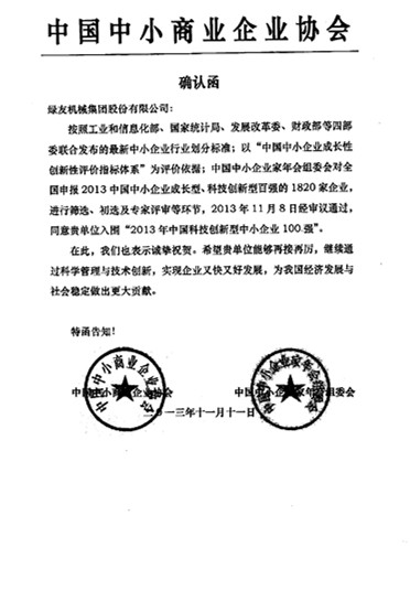 綠友榮獲“2013年中國科技創(chuàng)新型中小企業(yè)100強(qiáng)” 確認(rèn)函: