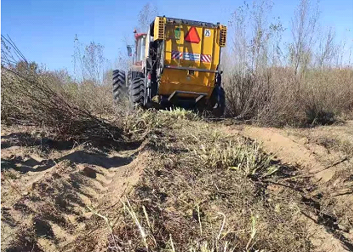 11月,綠友集團工作人員與內(nèi)蒙地區(qū)客戶接洽后,應(yīng)客戶之邀,攜進口檸條收割機設(shè)備前往客戶所在地區(qū),開展為期一日的產(chǎn)品演示。此地區(qū)地形崎嶇不平坦,含沙量很高,類似沙漠地帶,對拖拉機的行進也會有不小的影響。檸條植株都是前些年飛播作物,長勢高矮排布基本不成規(guī)則,作業(yè)難度很大。